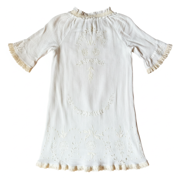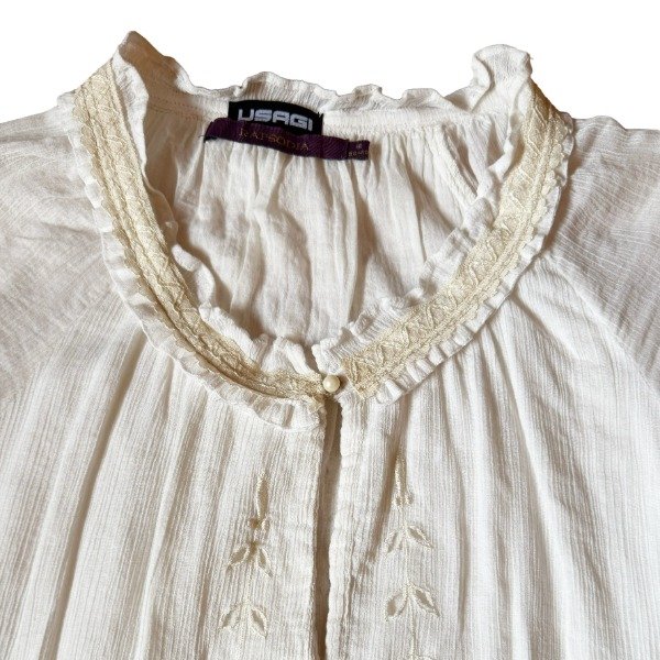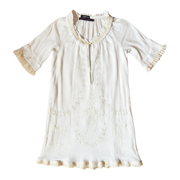 Esta pieza fue creada a partir de un vestido de la marca argentina Rapsodia. Tiene mangas 3/4, bordados originales y detalles en encaje plisado.