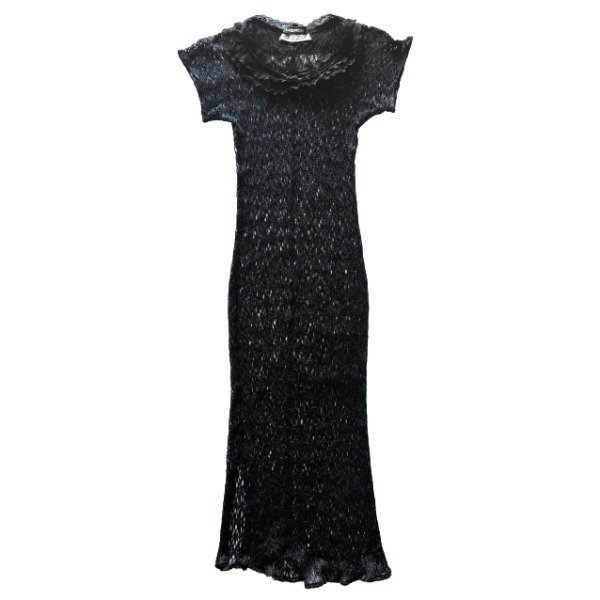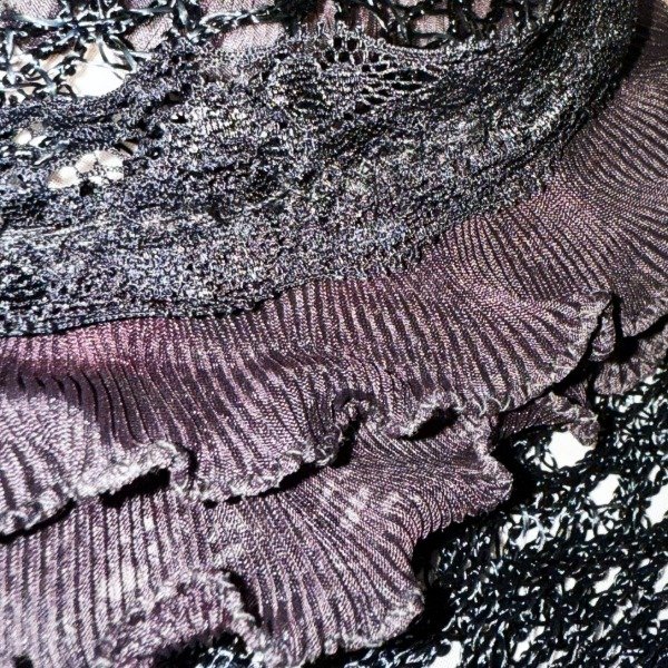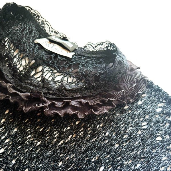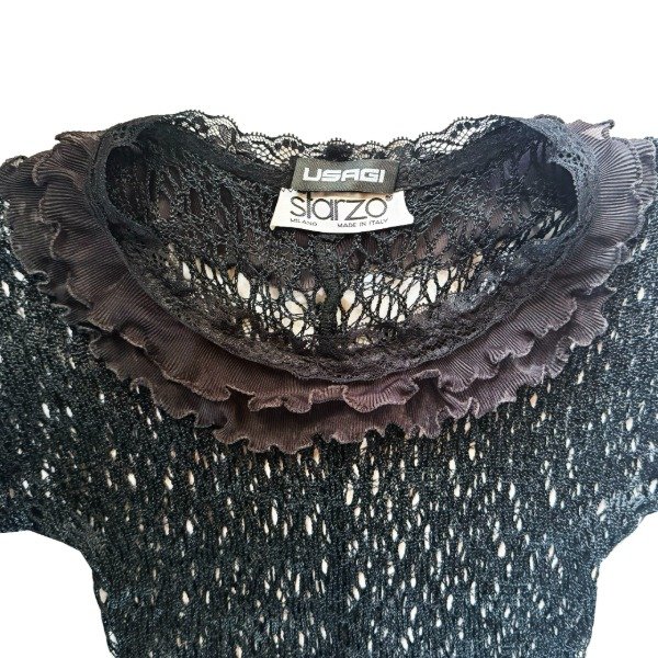 Esta prenda fue creada a partir de un vestido de trama calada de la marca italiana Sfarzo. Tiene una silueta que se adapta al cuerpo y un cuello con encaje y volados plisados que le aportan un gesto romantico y sofisticado.